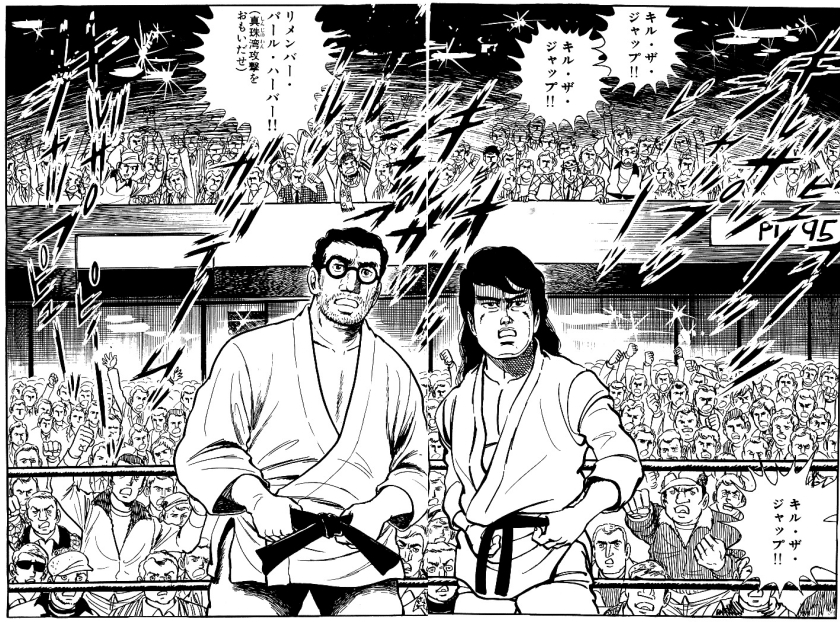 ↑対日感情最悪の会場で「キル・ザ・ジャップ」の洗礼を受けるマス大山。この後レンガを素手でぶち折って会場を戦慄させる。